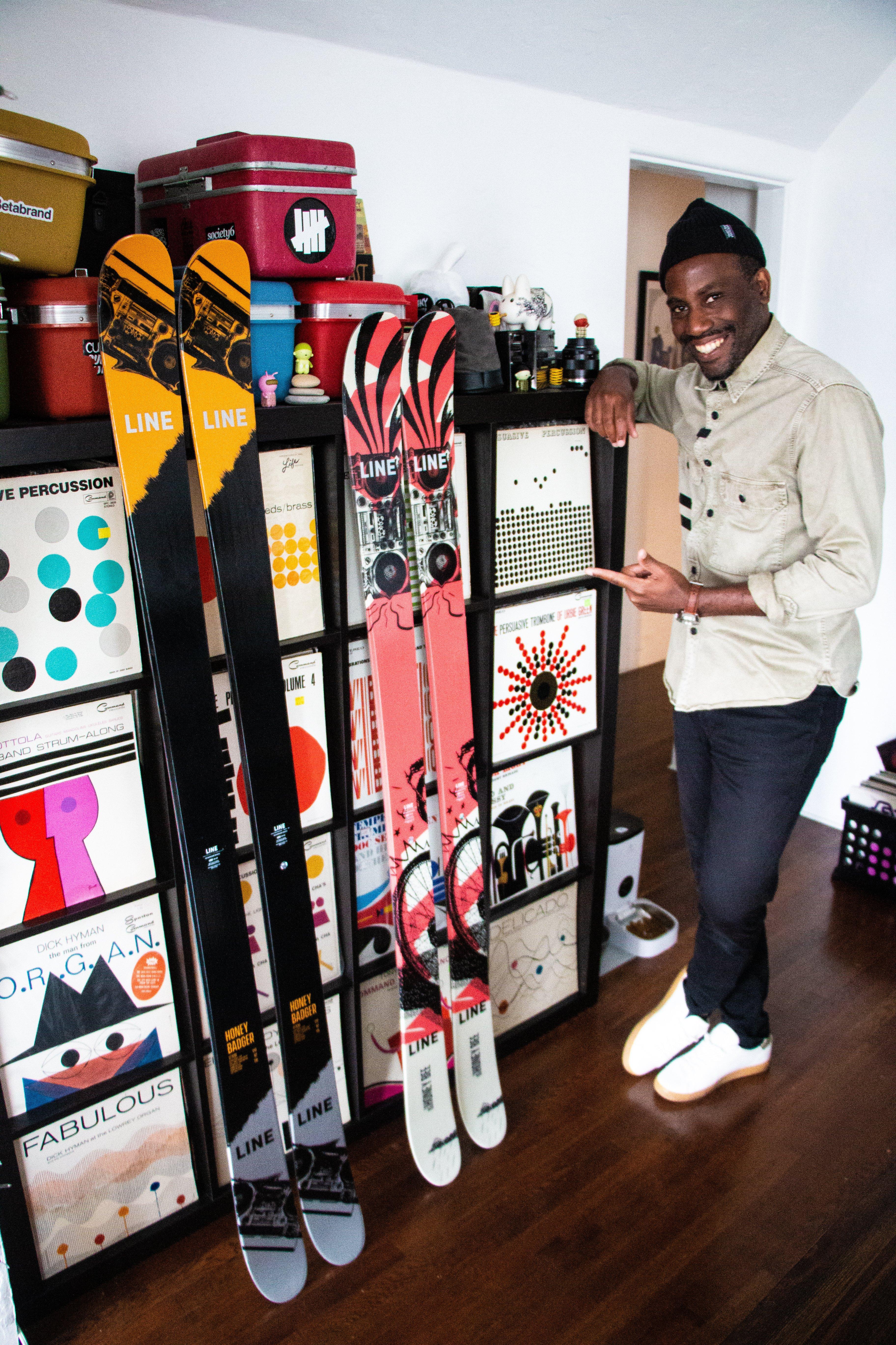 Meet Milton Campbell, the graphic design artist behind the 22/23 LINE Honey Bee and Honey Badger Skis. Milton, who designs within the Brokin nglish Design Collective, and goes by Omega Whatts as a DJ and Musician, has been a freelance artist for almost two decades. As an audio and visual learner, Campbell's workspace is surrounded by records, turn tables, and synthesizers, all of which he uses to draw inspiration for his work, and in this case, the 22/23 Honey Bee and Honey Badger.